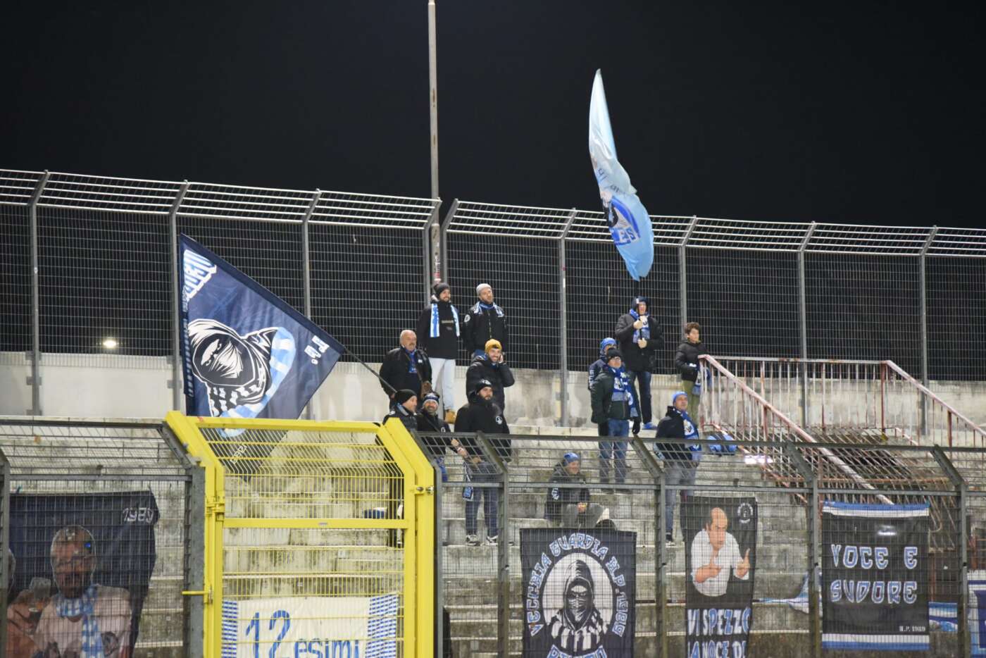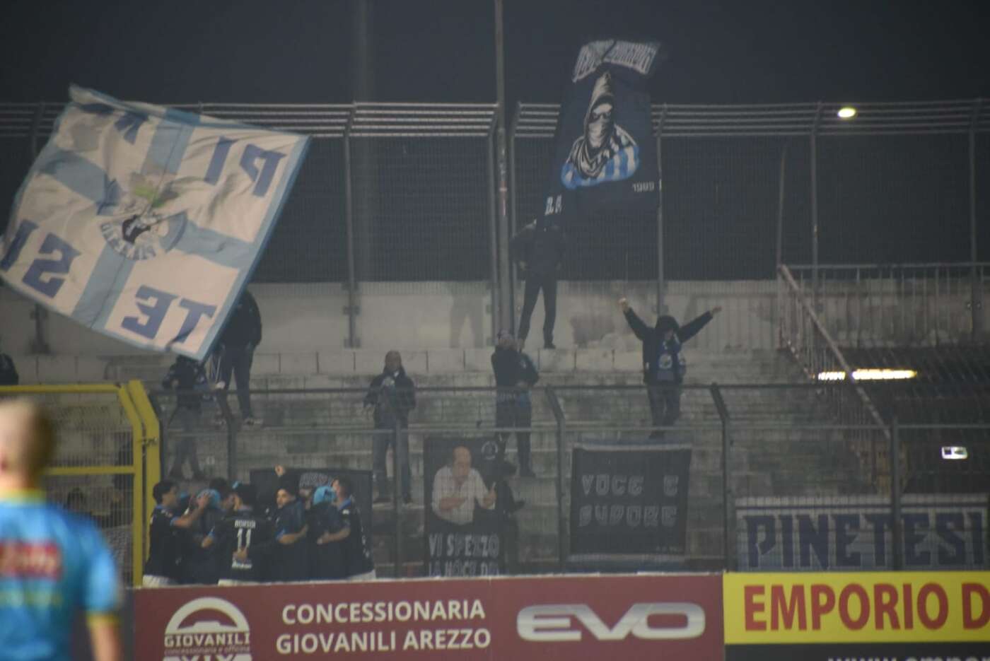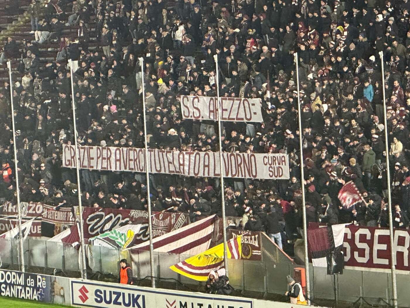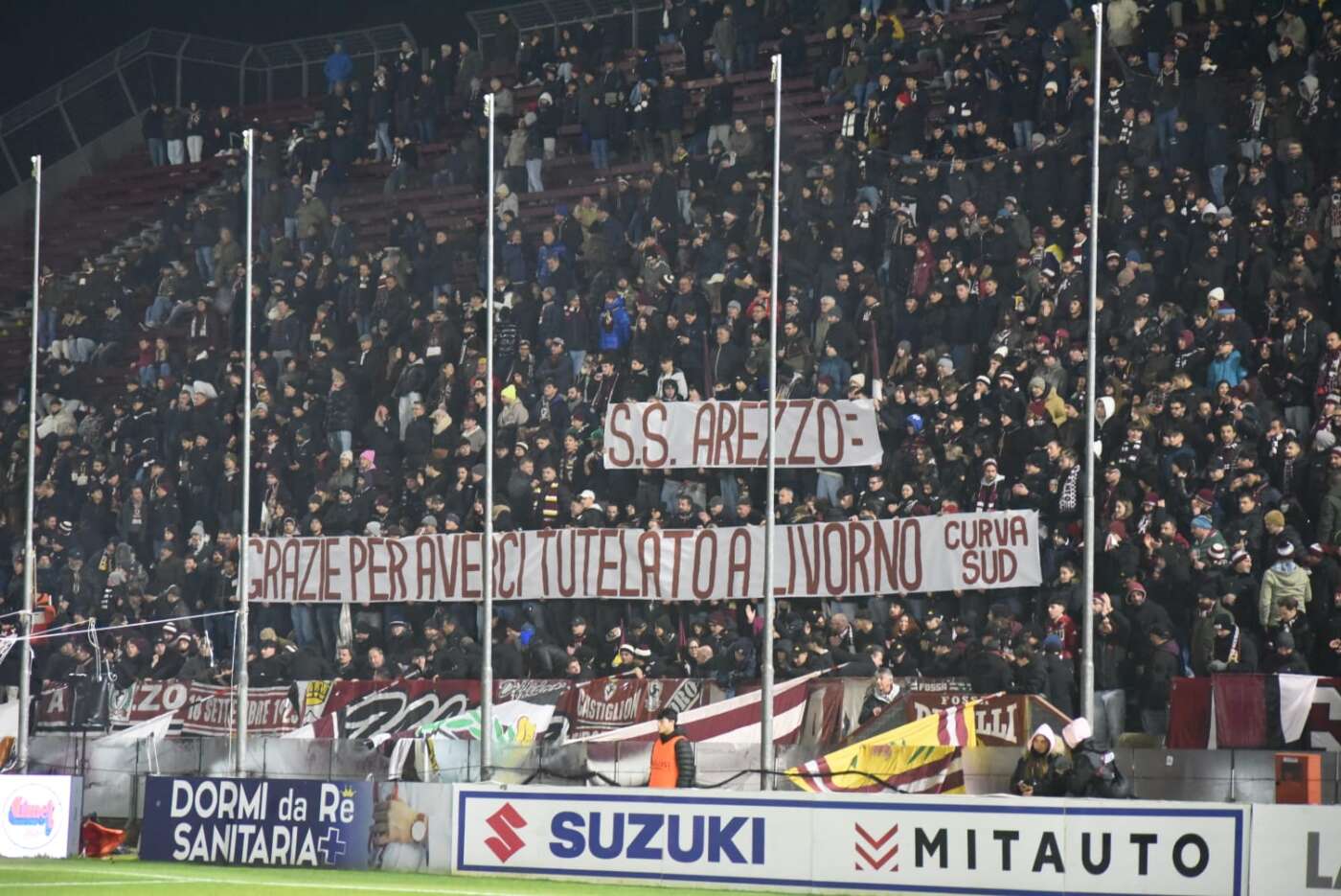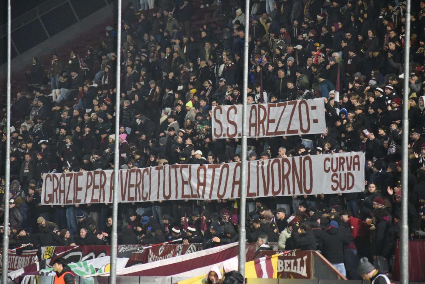 Come sempre autorevoli gli striscioni della Sud, che espone “Trasferte libere” durante i primi dieci minuti di assenza per protesta. Poi arriva il ringraziamento alla società: “S.S. Arezzo: grazie per averci tutelato a Livorno” e infine “Passano gli anni e non lo avete capito: senza gli Ultras il calcio è finito”.