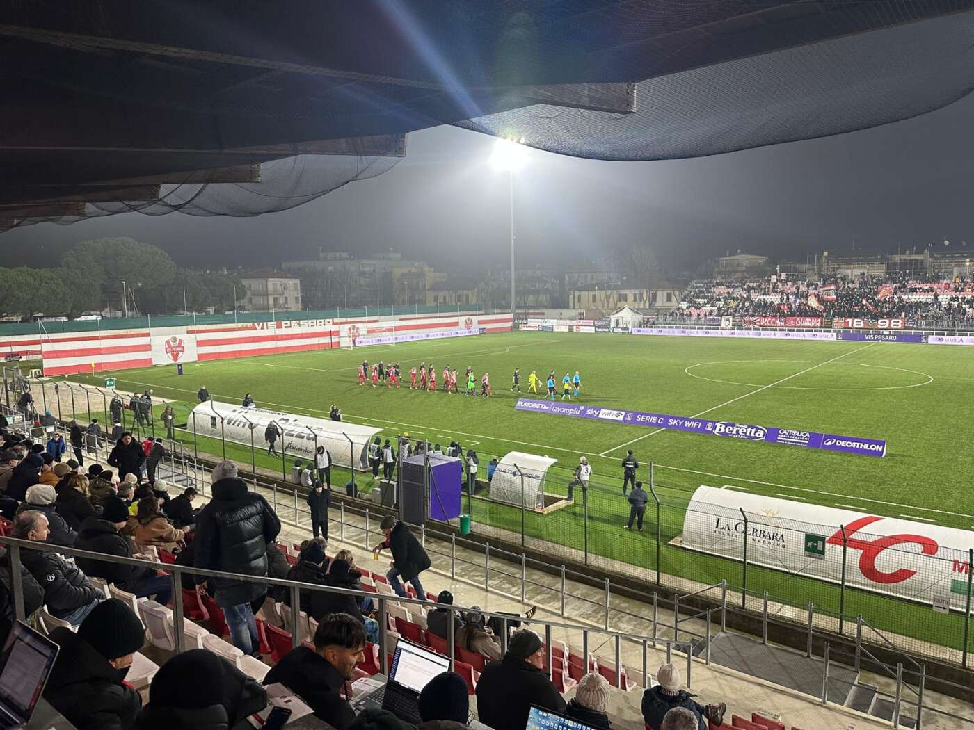 Al 37’ arriva il primo cartellino del match: ammonito Tavernelli per un intervento deciso su Stabile al limite dell’area biancorossa.