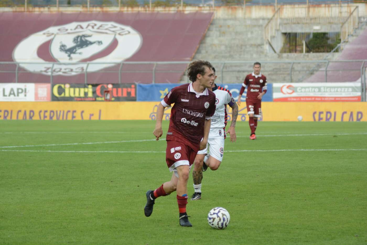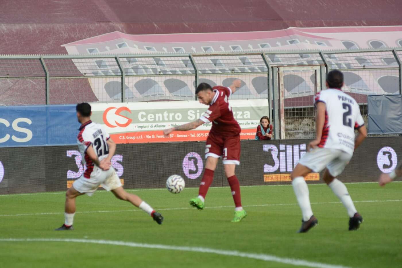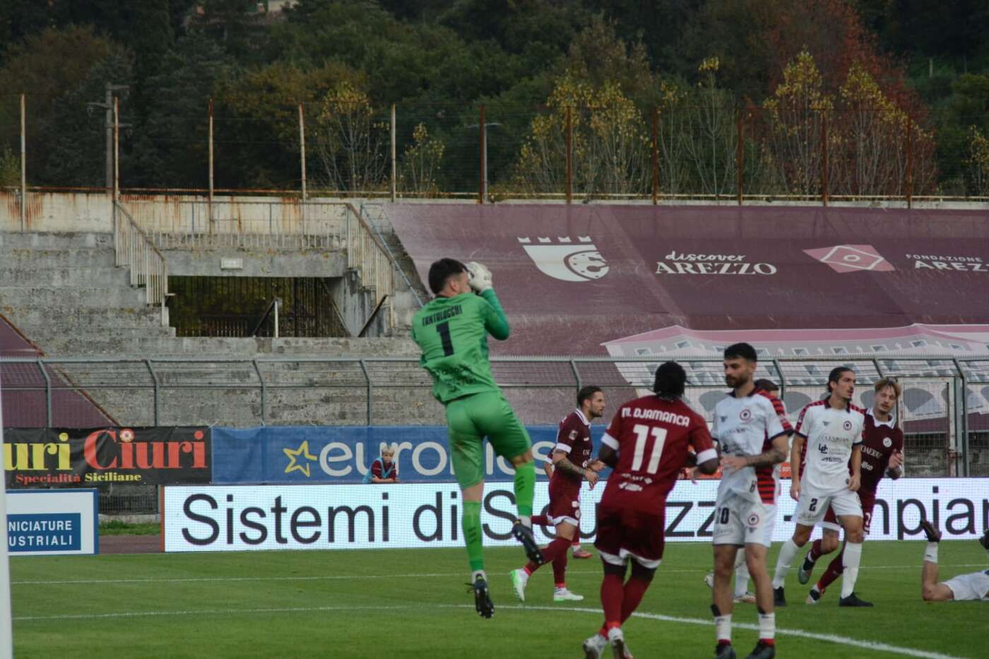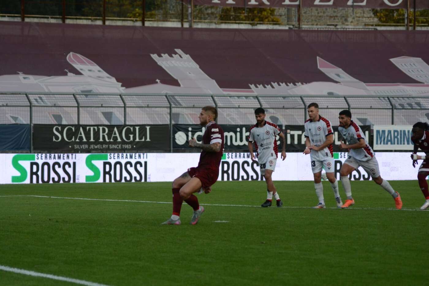 Arezzo arrembante fin dai primi minuti di gioco: da destra De Col e Pattarello ispirano e per due volte gli amaranto vanno vicini al vantaggio. Nel primo caso, al 3′, Chierico non riesce nella deviazione vincente per un soffio, poco dopo è Tavernelli a colpire a botta sicura su cross del numero 10, murato da un difensore avversario. Il gol è nell’aria e lo mette a segno Pietro Cianci al 16′: l’azione parte dalle retrovie, con un lancio per Tavernelli che ci crede e tiene la palla in campo, appoggia a Righetti che crossa in mezzo per Cianci. Il 71, in pregevole torsione, insacca di testa alla sinistra di Tantalocchi il terzo gol della sua stagione.