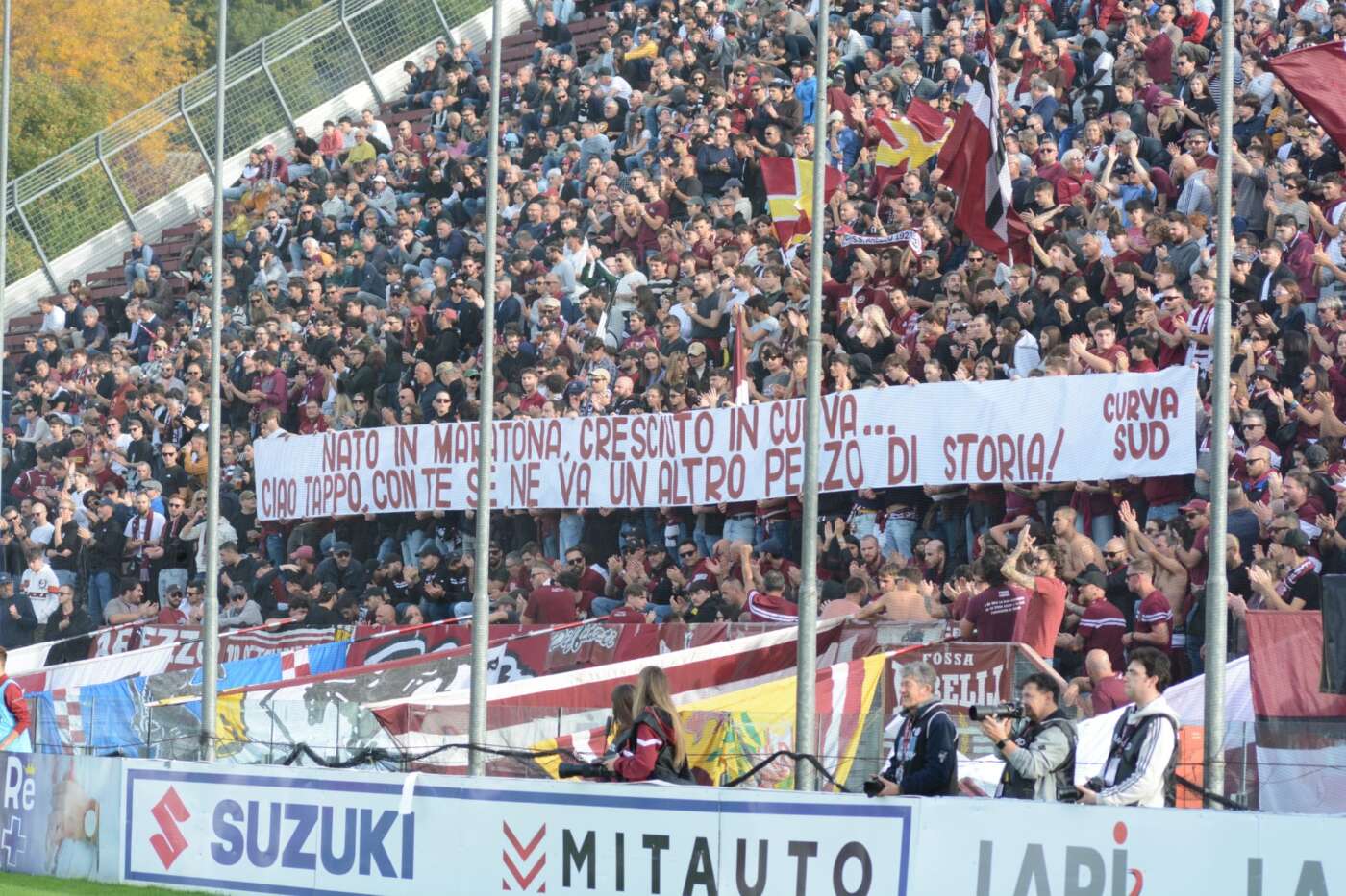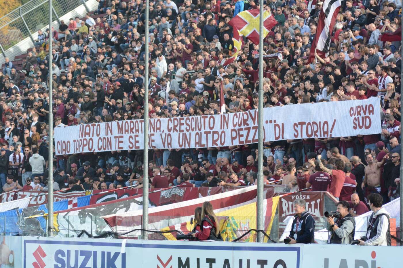 Al 25’ la curva Minghelli espone uno striscione: “Nato in maratona, cresciuto in curva. Ciao Tappo, con te se ne va un altro pezzo di storia!“, in ricordo di Giorgio Sorini, storico tifoso amaranto scomparso in settimana.
