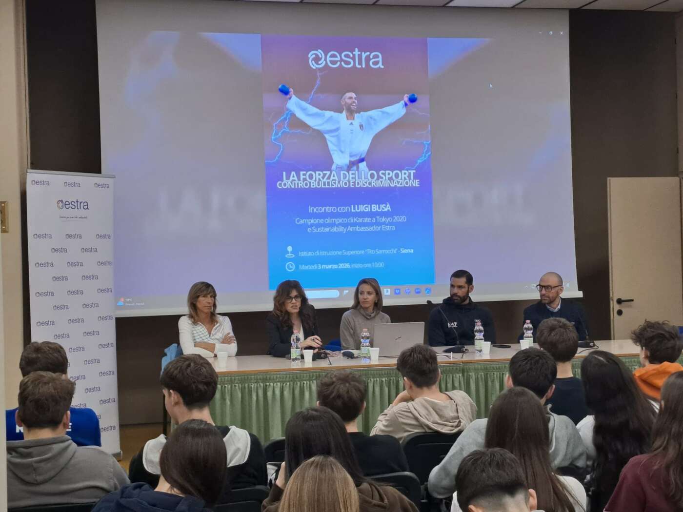 Protagonista dell’incontro è stato Luigi Busà, campione olimpico di karate ai Giochi di Tokyo 2020 e Sustainability Ambassador di Estra, che attraverso la propria esperienza personale e sportiva accompagnerà studentesse e studenti in un cammino di consapevolezza e responsabilità