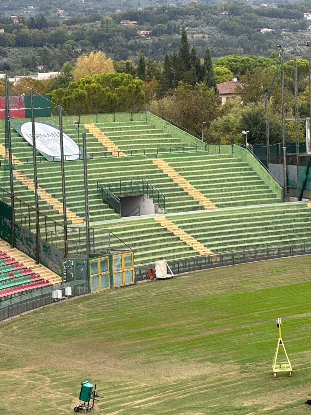 Curva ospiti desolatamente deserta per il divieto imposto dalla Prefettura di Terni ai sostenitori dell’Arezzo, ma con un solo, eroico puntino amaranto immortalato dal nostro inviato. Tra i seggiolini del “Liberati” spicca infatti la bandiera del Cavallino, sventolata da un solitario tifoso dell’Arezzo. Evidentemente residente in Umbria, ha voluto comunque esserci, sfidando da solo tutti i tifosi della Ternana. Un gesto di fede e di coraggio che racconta più di tante parole cosa significhi oggi essere amaranto.