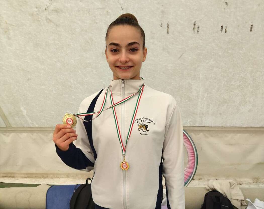 Nel campionato Gold di ginnastica ritmica, le ginnaste della società Falciai si sono nuovamente distinte conquistando ben due titoli di campionesse regionali e uno di vicecampionessa regionale., oltre ad altri ottimi piazzamenti. Nella categoria Allieve 1, la giovanissima Nicole Pietrini ha conquistato il titolo regionale, salendo sul gradino più alto del podio. Nella categoria Allieve 5, Adele Bray ha confermato il suo valore aggiudicandosi la gara e laureandosi campionessa regionale. Adele era stata recentemente convocata a Settimo Torinese per un collegiale in preparazione a un futuro lavoro di squadra junior. Nella categoria junior 1, Maria Vittoria Berti ha conquistato il titolo di vicecampionessa regionale. Maria Vittoria fa parte già da anni della rosa di ginnaste di punta della società aretina e lo scorso anno, insieme a Sofia Boschi, Ginevra Bindi e Greta Furlan, ha permesso alla società Falciai di risalire nella massima serie, in serie A1. Nella stessa categoria è scesa in pedana Marta Massai, che ha conquistato un ottimo quarto posto. Bellissimo risultato per Massai, che qualche mese fa era stata fermata da un infortunio ed ha dimostrato di essersi ripresa alla grande. Tra le senior, categoria in cui gareggiano le ginnaste più esperte, Greta Furlan si è piazzata al quarto posto e Sofia Celestini al settimo, presentando il loro ricco programma di gara. Tra le allieve, oltre alle campionesse Bray e Pietrini, la società aretina ha schierato un nutrito gruppo di promettenti ginnaste: nelle allieve 4, Elisa Cuccaro ha mostrato in pedana la determinazione che la caratterizza ed ha ottenuto il quinto posto. Nelle allieve 2, le giovani Linda Massai e Martina Campanelli si sono piazzate in settima posizione e Margherita Gioni ha ottenuto il decimo posto mentre nelle allieve 1 Ludovica Beoni si è classificata al nono posto. Molto bene le giovani allieve, tutte classificatesi tra le migliori dieci toscane e mostrando notevoli passi avanti. Grande assente in questo campionato una delle ginnaste di punta della società aretina, che da anni varca le pedane italiane più importanti: Sofia Boschi, ginnasta molto espressiva, che tra le senior impreziosisce sempre le competizioni alle quali partecipa. A causa di un infortunio non ha potuto prendere parte al campionato. Durante la gara è scesa in pedana anche Ginevra Bindi, esibendosi con il suo programma completo, ma non partecipando alla classifica, essendo ammessa direttamente alla fase nazionale, grazie alle varie convocazioni a rappresentare l’Italia in varie competizioni internazionali, tra le quali gli ultimi mondiali in Bulgaria e la recente partecipazione ai giochi del Mediterraneo in Turchia dai quali è tornata con tre ori al collo. Ottimo lavoro svolto dalla responsabile del settore Gold Maria Cristina Cammelli e dalle tecniche Natalya Izieva e Caterina Moretti, coadiuvate dall’ insegnante di danza Amy Polvani.