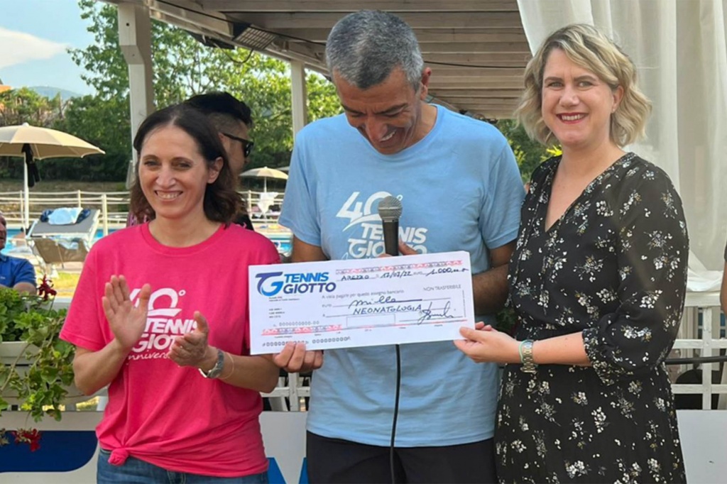 Sport e sociale uniti alla beneficenza. La “40ore” di eventi per festeggiare i 40 anni di attività del Tennis Giotto ha trovato il proprio epilogo nella consegna di un assegno di 1.000 euro al Comitato Aretino Neonatologia per sostenere le attività dei reparti di neonatologia e pediatria dell’ospedale San Donato. La donazione è stata frutto delle libere offerte raccolte in un solo fine settimana dove sono stati coinvolti tecnici, dirigenti e soci che hanno fatto parte della storia dal 1982 a oggi, con la volontà di portare un contributo anche a una realtà locale che da anni è impegnata nell’incrementare le strumentazioni di cura nei reparti ospedalieri dedicati ai più piccoli e nel fornire un supporto concreto ai genitori dei bambini prematuri. La conclusione dei festeggiamenti, in quest’ottica, è stata condivisa anche con la dottoressa Letizia Magi (direttrice di neonatologia e terapia intensiva neonatale) e Anna Cerea (membro del consiglio direttivo del Comitato Aretino Neonatologia), a cui il presidente del Tennis Giotto Luca Benvenuti ha consegnato l’intera cifra raccolta.