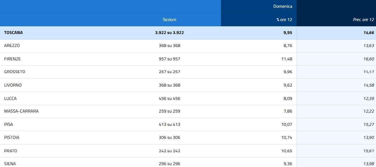 Tra le province con più elettori c’è in testa quella fiorentina (781 mila), seguita da Lucca (quasi 356 mila, ma un settimo vive all’estero), Pisa (341 mila), Livorno (287 mila), Arezzo (quasi 274 mila) e Pistoia (quasi 247 mila). Le province con meno elettori sono Siena (208 mila), Prato (182 mila), Grosseto (177 mila) e Massa-Carrara (quasi 171 mila).