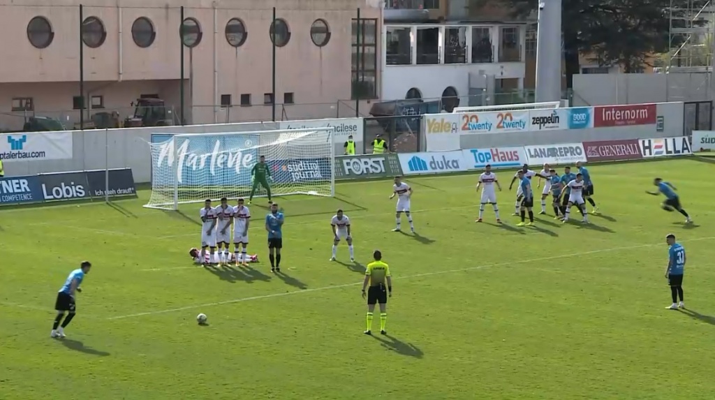 44′ Punizione di Pinna dalla trequarti sul secondo palo: la palla viene toccata da un giocatore del Südtirol e termina fuori, ma l’arbitro ferma il gioco per una posizione irregolare