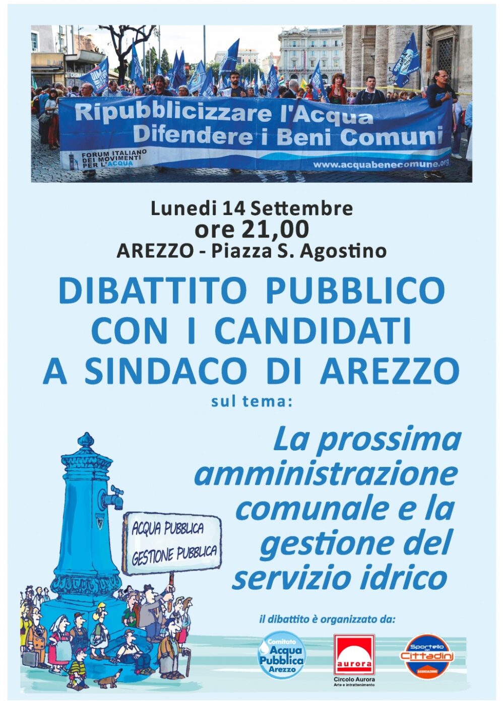 Il Comitato Acqua Pubblica di Arezzo , in collaborazione con il Circolo Aurora – Sportello dei cittadini e il Movimento Consumatori di Arezzo, invita i candidati a sindaco di Arezzo a partecipare a un dibattito pubblico sul tema della gestione del servizio idrico